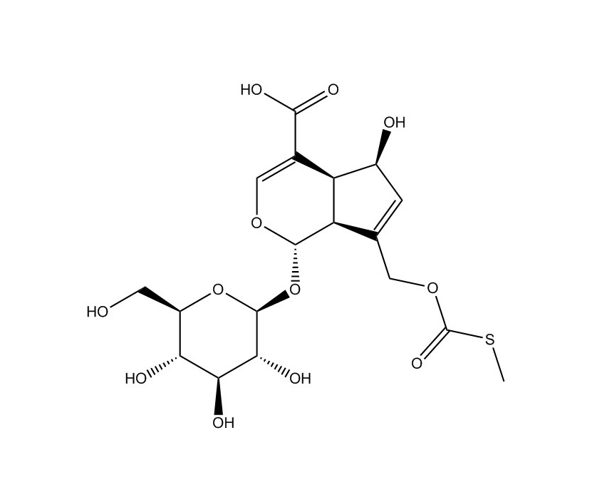 【英文別稱】 (1S,4aS,5S,7aS)-1-(β-D-Glucopyranosyloxy)-5-hydroxy-7-({[(methyls ulfanyl)carbonyl]oxy}methyl)-1,4a,5,7a-tetrahydrocyclopenta[c]pyr an-4-carboxylic acid